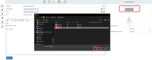 Aukeavassa ponnahdusikkunassa selaa ja valitse tiedosto, jonka haluat liittää viestiin.